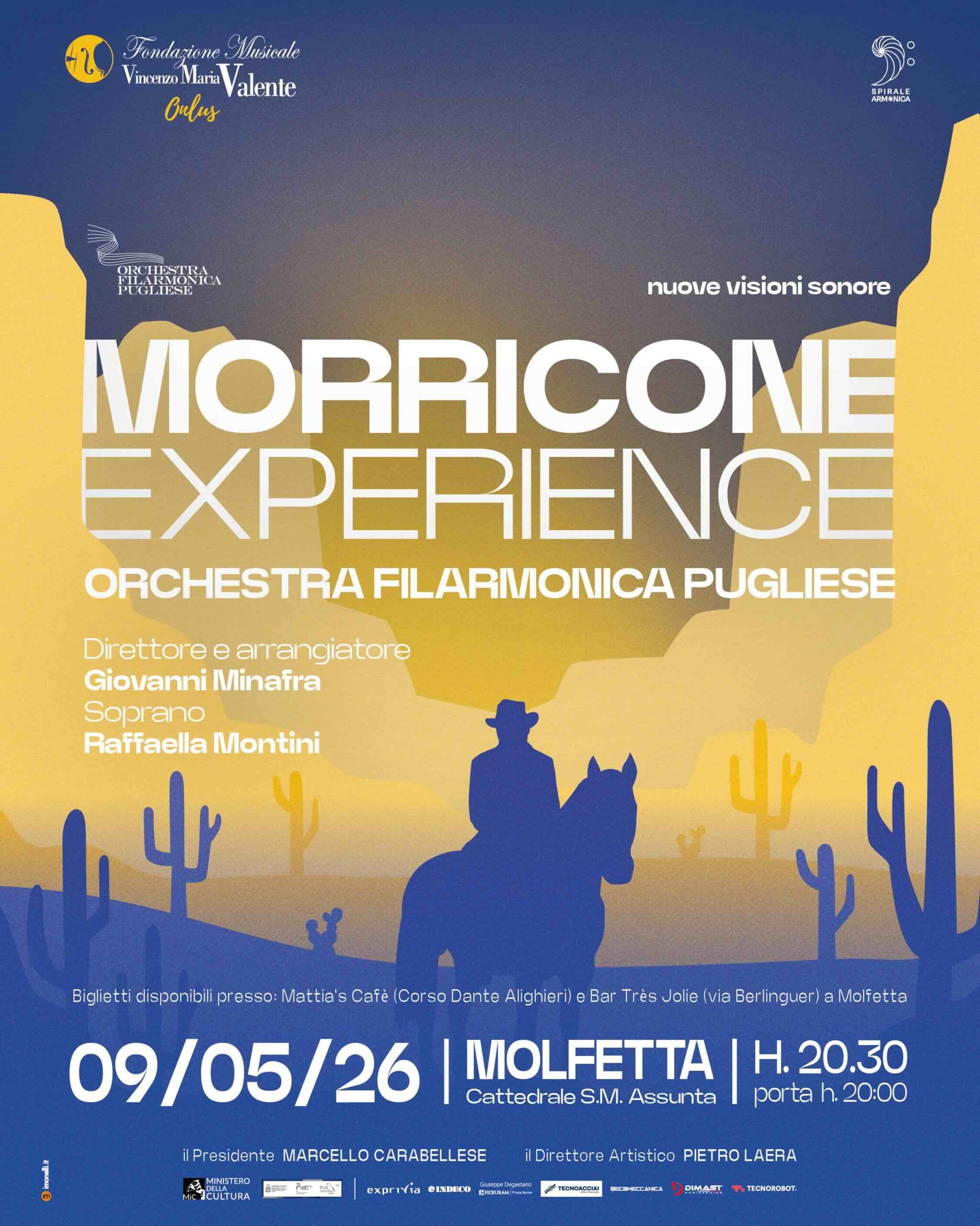 “Morricone Experience – nuove visioni sonore” è un concerto immersivo e coinvolgente che celebra il genio di Ennio Morricone, accompagnando il pubblico in un viaggio emozionante tra alcune delle colonne sonore più iconiche della storia del cinema.
